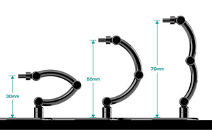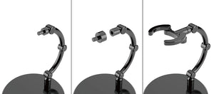 Presenting a set of 4 simple and affordable! A set of four black display stands. These stands, perfect for small figures around 10cm in height, feature a plain, transparent design. The support arm is equipped with a 3mm pin for connecting to holes of corresponding size. Attachable clamp-style parts and hexagonal pin parts for Nendoroid figures* are also included. The diameter of each base is around 6cm. Two types of support arms—a curved type and straight type—are included. The curved support arm can be adjusted from 3 to 7cm in height, while the straight support arm can be adjusted from 4.5 to 10.7cm in height. *May not be compatible with some products.