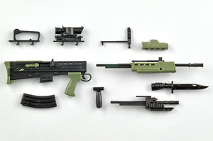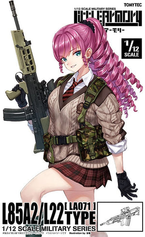 1/12 scale kit of L85 using two molding colors. A2-specific styling such as comma-shaped cocking handle and improved magazine is faithfully reproduced. Carrying handle or scope is selectable. You can also select a unique sword wearing state.